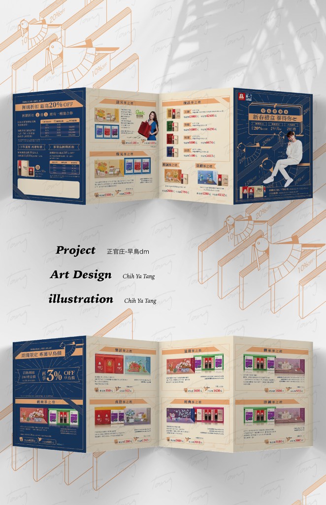 設計理念:配合客戶提出的需求,畫了早起的鳥兒叼著禮盒送禮過來的意象,並配合線條感的插圖融入整體設計,把此圖像同時當作圖樣使用,貫穿整個DM,主色調使用深藍色及金色,代表著品牌百年歷史與優越的質感及價值。