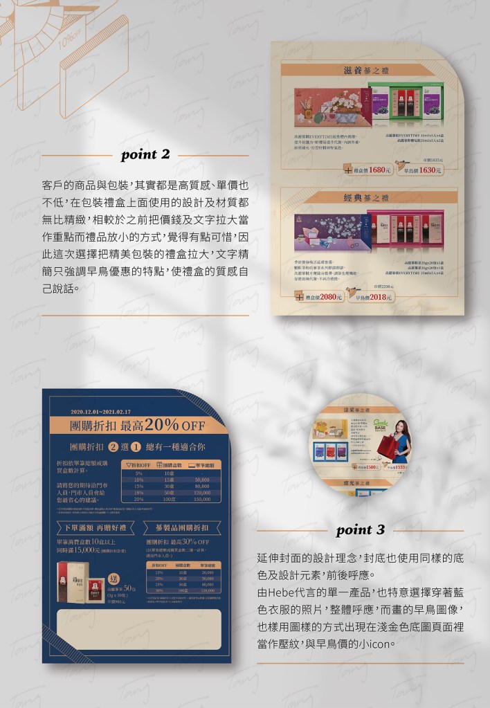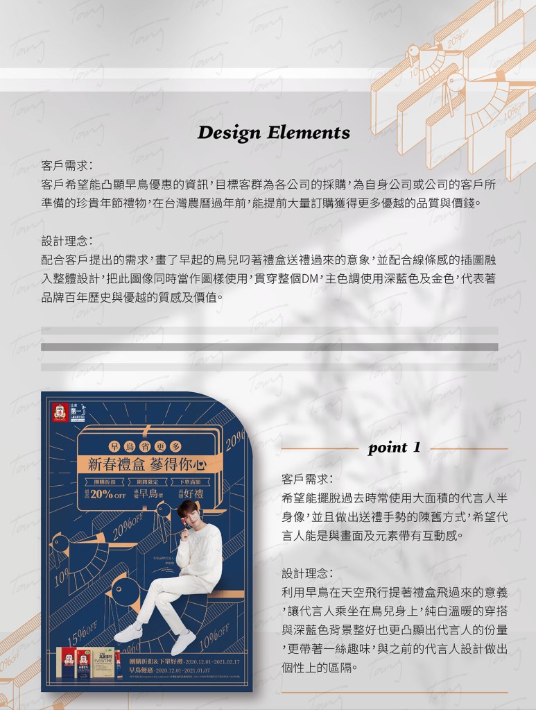客戶需求:客戶希望能凸顯早鳥優惠的資訊,目標客群為各公司的採購,為自身公司或公司的客戶所準備的珍貴年節禮物,在台灣農曆過年前,能提前大量訂購獲得更多優越的品質與價錢。